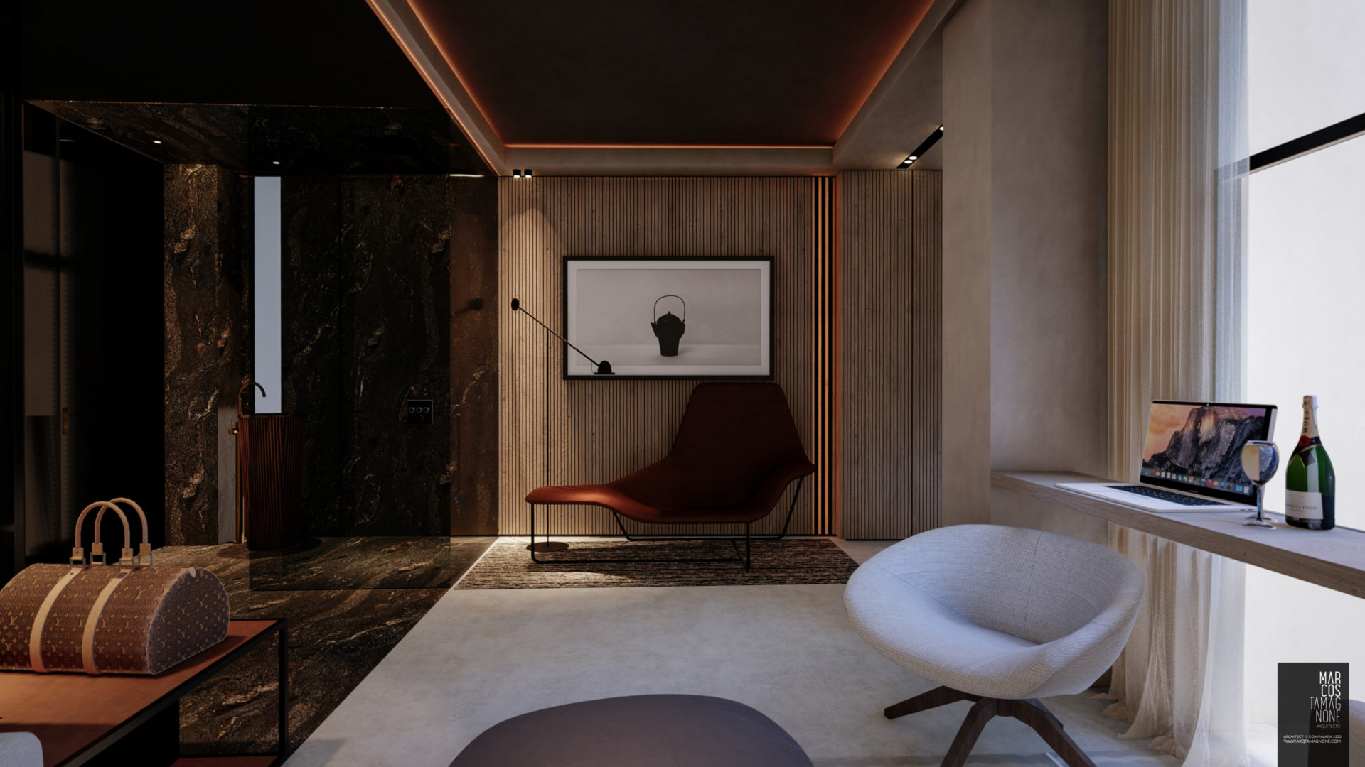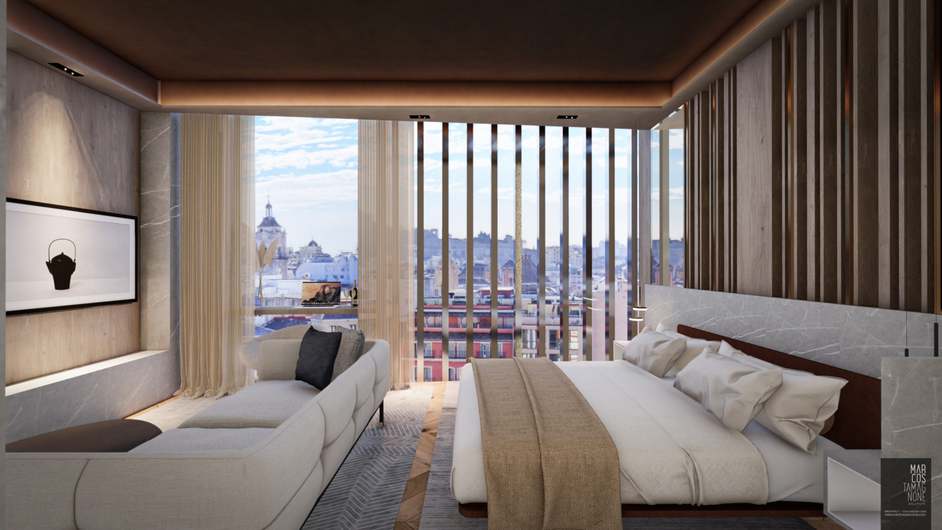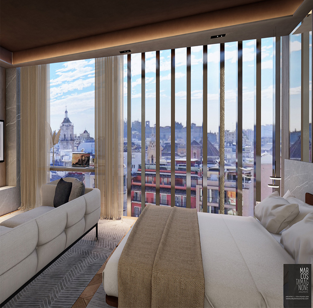 Hotel Boutique en el centro histórico de Málaga, basada en la idea conceptual de la LUZ en dónde sus 14 habitaciones, todas totalmente diferentes, cambian sus acabados y materiales según la cantidad de luz que tienen provenientes del exterior (+LUZ-). Habitaciones totalmente domotizadas, con controles de última tecnología.